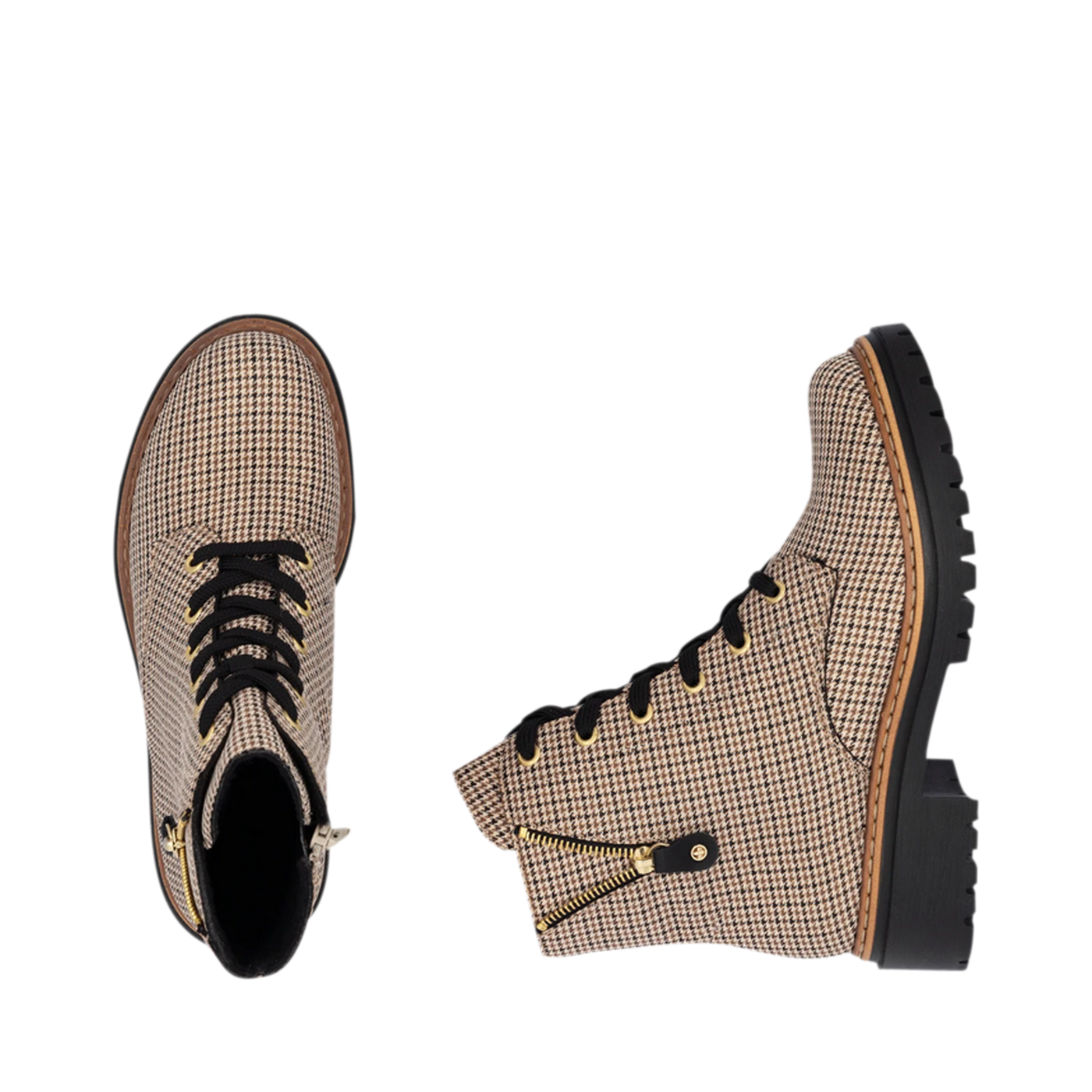 Cette botte à lacets pour femme signée Rieker séduit par son look audacieux et tendance, grâce à son motif à carreaux dans les tons beige et noir. Sa silhouette à bout rond apporte une touche décontractée, tandis que le talon d’environ 4 cm offre une légère élévation tout en restant confortable pour une utilisation au quotidien. Dotée d'une fermeture éclair intérieure, elle s'enfile facilement, et une fermeture éclair décorative à l'extérieur ajoute une note de style supplémentaire. Sa doublure textile légère en fait un choix idéal pour les saisons intermédiaires, alliant esthétique originale et praticité sans compromis.